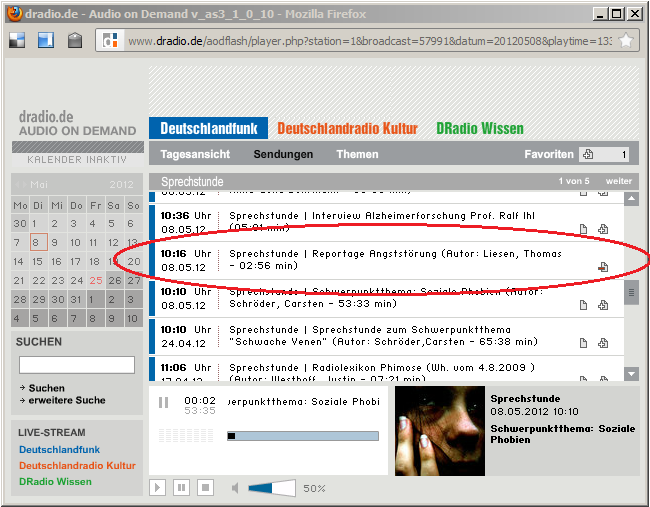 Leider gibt es zu diesem Beitrag keinen direkten Link. Im Flash-Player ist er jedoch leicht unter dem Titel „Sprechstunde | Reportage Angststörung (Autor: Liesen, Thomas – 02:56 min)“ zu finden.